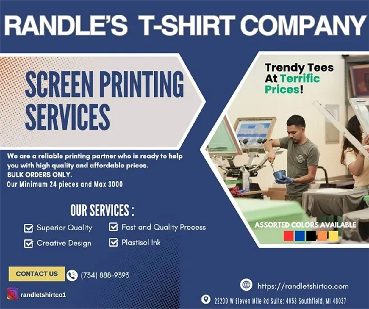 At Randle T-Shirt Co, we are dedicated to providing our clients with high-quality custom t-shirts. We utilize only the finest materials and equipment to ensure your project looks its best. With years of experience in the t-shirt business, our team of experts is committed to exceeding your expectations, making us the screen-printing company you can rely on for all your custom t-shirts needs in bulk order.
